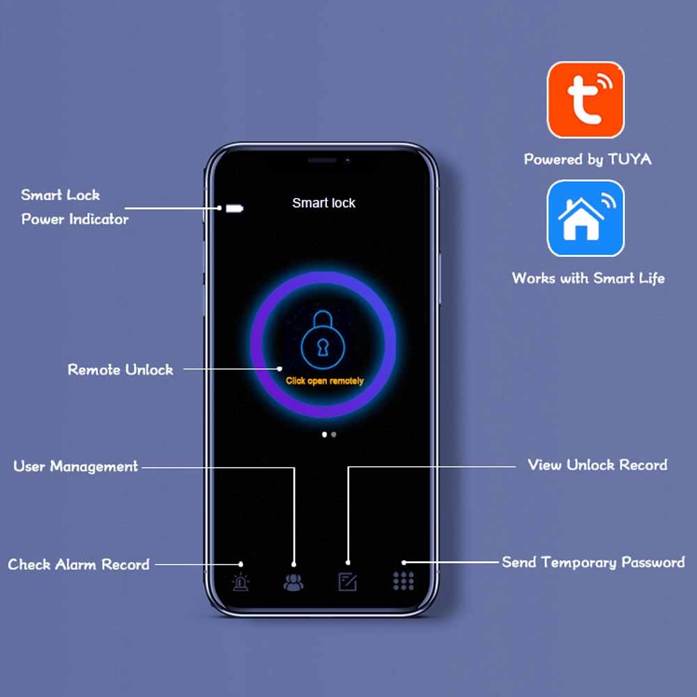 Il a un commode contrôlent le système et 6 manières d'ouvrir : L'empreinte digitale ouvrent, l'APPLI de BLE ouvrent, WiFi à distance ouvrent, mot de passe PIN Unlock, la carte ouvrent et les clés mécaniques Unock.It répondront à tout votre besoin au sujet de serrure intelligente. Avec la gestion avancée d'APPLI, par l'intermédiaire de WiFi ou de BLE relier la serrure intelligente à votre smartphone, et à vous peut contrôler votre serrure de porte intelligente n'importe où et n'importe quand.