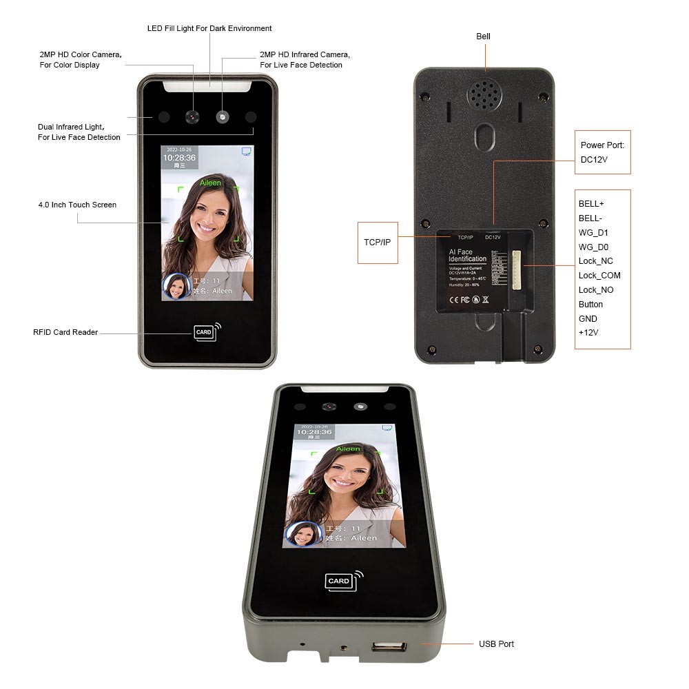 Reconnaissance des visages dynamique, mot de passe, carte d'ID/IC facultative |